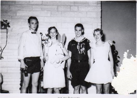 More of those old photos from 1954. One thing I noted and hesitate to mention, but as I looked at them, an awful lot of the guys and gals look bowlegged. I suspect a good psychologist could put a spin on it that they were somewhat nervous? Freaked? Or inhibited at being photographed in their costumes. Also by the way, there seem to be a mixture of our class and some from 1955.