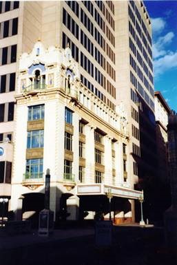 Opened in 1926 for the Publix-Paramount chain, this large downtown theater was designed by the Boller Brothers firm, and was done in Spanish Colonial and Rococco style. Its fantastic terra-cotta facade, complete with columns and multicolored arches decorated with gilded medallions, in addition to its huge vertical marquee, were as spectacular as the interior, which was one of the city’s finest movie houses of the 20s, along with the Empire, Aztec and, later, Majestic Theatres.