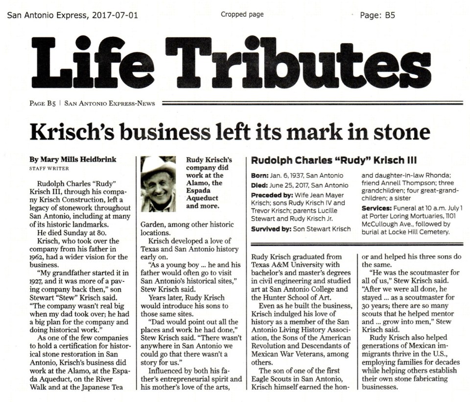 Rudy led the family construction business his father started in 1927, which is celebrating its 90th year. He has successfully r un Krisch Construction throughout the years with the assistance of his sons and grandsons. He utilized his civil engineering degrees and his natural artistic ability in his work to help beautify San Antonio. There are very few places you can go in SA and not see his legacy and work including the River Walk, the museums, the missions and many parks across the city.