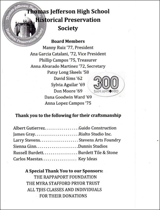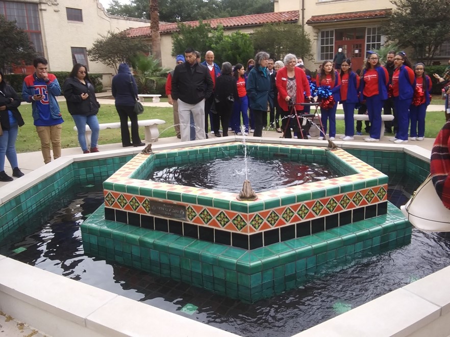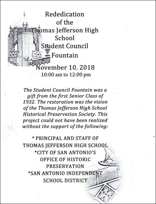 The renovation of the fountain in the Student Council patio has been completed. The fountain is a gift from the Class of 1932, the first graduating class. The renovation project was undertaken by the TJHS Historic Preservation Society. The effort covered several years from the glimmer of an idea to fruition. Many from our class participated in this project by buying one or more bricks with a brief inscription on them. Probably 99% included our name and class year, while a few commemorated other classmates, teachers, or good wishes.