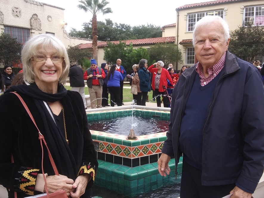 On a bleak Saturday morning on November 10th, a rededication ceremony celebrated completion. Our class reps were Dorothy McGraw, Betty Russell, Johnny Coyle, and me. Nobody elected us—we just heard about it and showed up. After a ribbon-cutting, the fountain switch was turned on and water flowed. This renovation restores the fountain exactly as it was, with some new tiles that color match. One surprise to us is that the original fountain had three frogs perched on the interior fountain spewing water. The frogs were long gone by 1951, when we started out.
