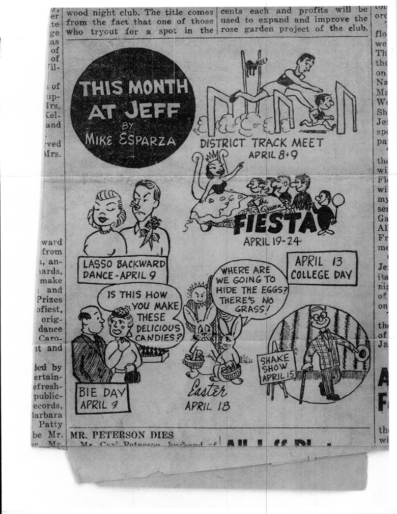 Mrs. Talliferro. She was a martinet, tall, thin, very black hair (most likely enhanced by her beautician) and always reminding us of her husband’s importance as the principal of Horace Mann. I did like her as a teacher. Some years later, after 1979, when I moved back to San Antonio, I was in Dennis Jewelry one day and I heard this booming voice from the opposite end of the counter. “That’s Talliaferro. Spelled T-a-l-l-i-a-f-e-r-r-o.“ Quickly I turned and saw an abundantly overweight woman with grey hair standing there. Naturally, I approached and asked if she taught at Jeff; she had and claimed to remember me. Then she launched into her fantasy of how she and the other two had been transferred to three schools which were all in trouble, implying that they were failing because of poor administration. She stated that each was sent to save the school. I do not believe that was the story behind the story. Mrs. Talliaferro died at 102.