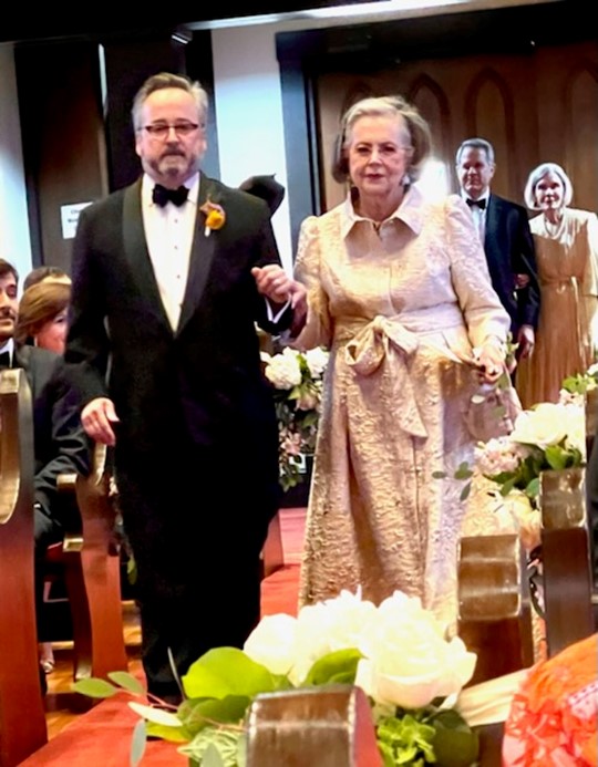 Laura Moore Brusenhan ” I am fine and see a few dear friends of the past namely, Sam n Mary Helen, Fay Armstrong, Jane Cobb, and Patricia Trimble Bryant. I’ll send you several pics of my granddaughter Milla Brusenhan’s wedding on May 7. (Note: Picture below of grandmother of the bride with son Harry Brusenhan, Jr. Such a strong resemblance to Harry Sr. for those who remember. Laura’s granddaughter was the queen of Fiesta this year and her first granddaughter was queen four years ago. Would that make Laura the dowager queen, and should we address her as ‘your highness’ of similar?)