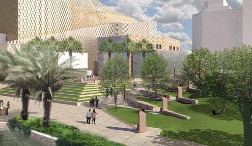 And here is a rendering of the river walk side. Originally an 18-foot wall  separated the auditorium from the river walk. The pillars up the right side commemorate the 32 medal of honor recipients from San Antonio.